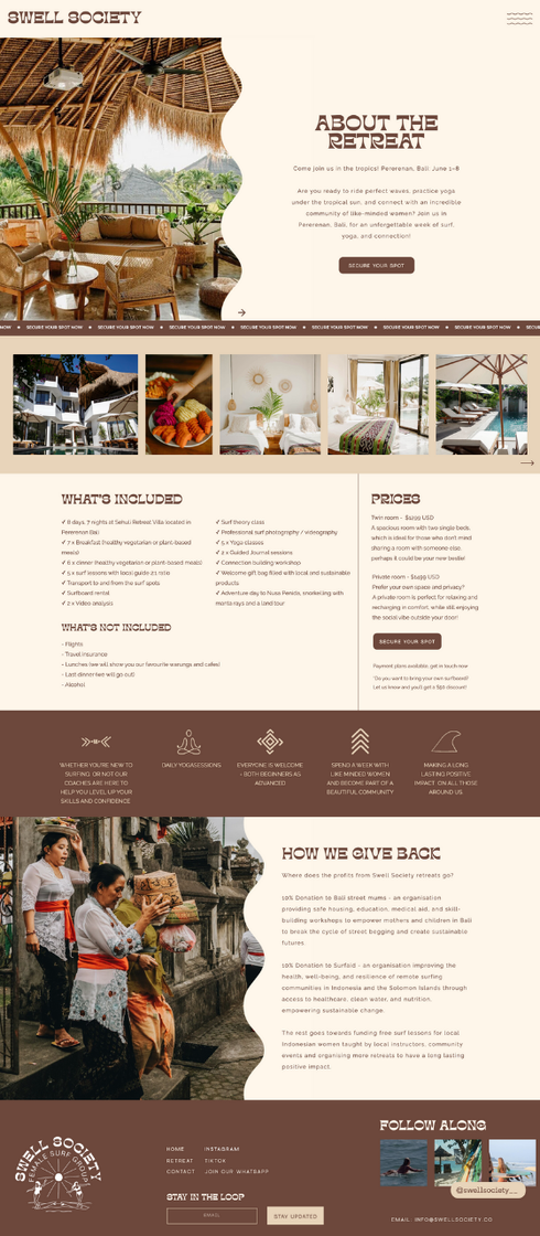 For the female surf retreat company Swell Society, we created a warm and refreshing website that captures their laid-back, ocean-inspired vibe. The design feels natural and effortless, combining soft tones, fluid shapes, and sun-soaked imagery to reflect their community-driven spirit and love for the sea.